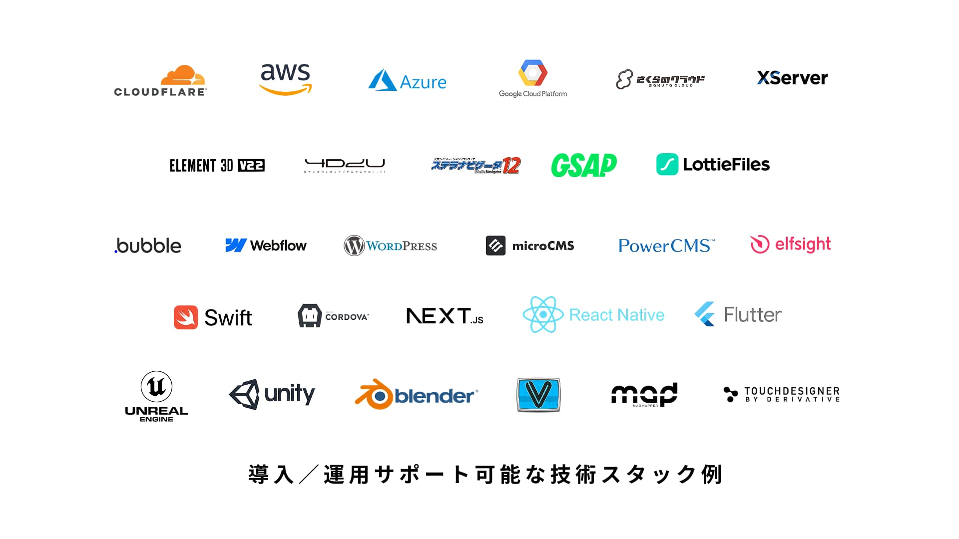 やりたいことを実現する過程で選択肢が狭まることがないように、パートナーと協業し映像表現やシステム構築に必要な技術スタックをカバー。小〜中規模のWebアプリやIOS/Androidアプリ開発も可能な体制を整えています。